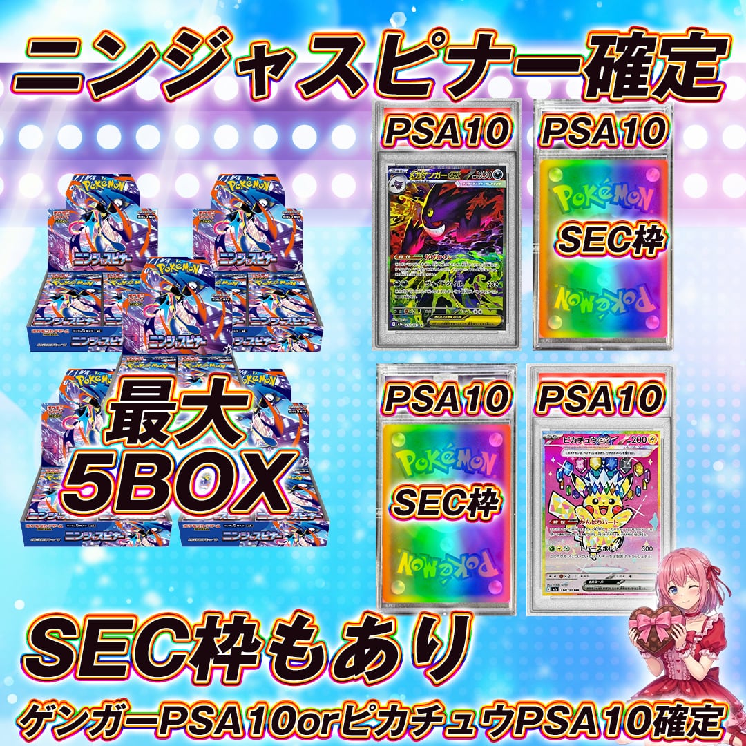 ポケモンカード新弾BOX+PSA10確定オリパくじ【ニンジャスピナー+ピカチュウPSA10orゲンガーPSA10確定!!最大5BOX❤️】